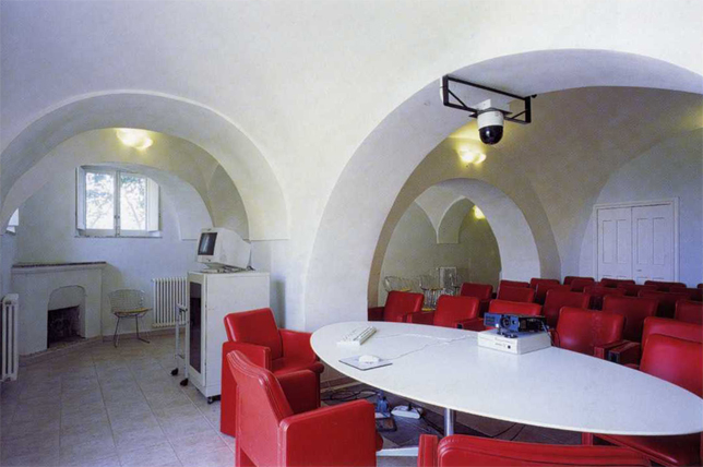 Upstairs there are the two main rooms, covered with mirrored vaults, and the "study" of Cerio which, together with the terrace with the pergolas, constitute the advanced body of the building. On the back, on the left are the bedroom, also with a mirrored vault, a small room with a barrel vault and the bathroom, on the right a small room, the kitchen and the stairs that lead to the roof and floor inferior. The first staircase is inserted in a loggia covered by a mirrored vault; the second, which starts directly from the kitchen, is the only indoor connection with the lower floor, directly from the entrance to the first floor. From the kitchen, going out onto the terrace and crossing an arch, you reach the "studio" of great plastic effect, embellished, in the south-east corner, by the sculptural chimneys. It was presumably built between 1930 and 1934, during the renovation of the house and the arrangement of the gardens. The small window is oriented towards the most beautiful glimpse of the Gulf of Naples that could be seen from the desk, actually made up of the same shelf as the sill that leans against the oblique wall.