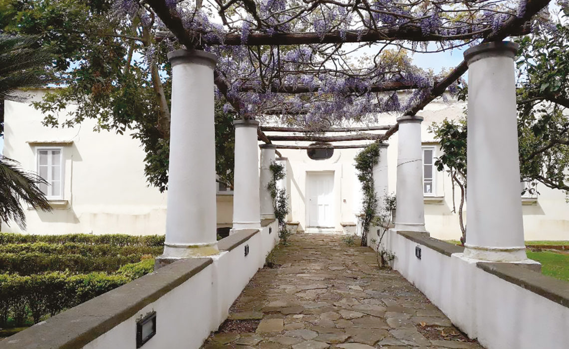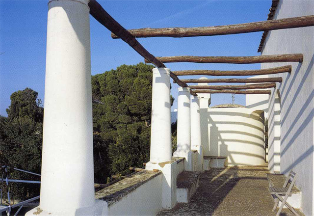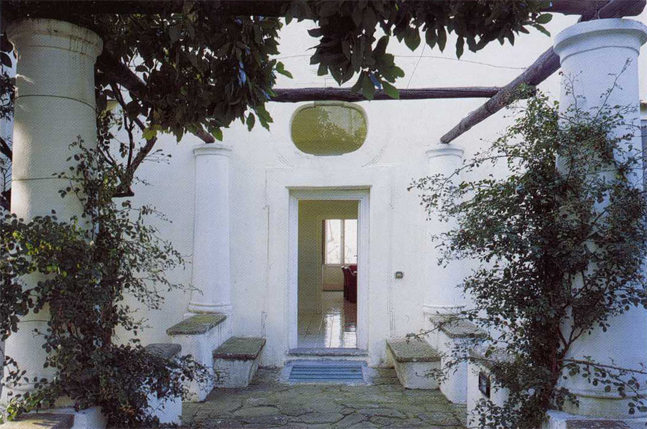The ground floor is reached from another entrance, also located on Via Finestrale, but at a lower level, passing through the garden-vegetable garden. The lower entrance was to be the entrance to the "country casino" with cisterns, vegetable garden and garden, or rather the first nucleus of what will become Casa Orlandi. The name of the rooms, indicated here to illustrate the architectural type, is to be understood as referring to the first work of the current use as a Congress Center of the "Federico II" University, which has not altered the configuration of the spaces in any way. The upper entrance attracts attention from the gate for the presence of the colonnaded pergola, with square spans, which monumentalizes the house and constitutes a precious testimony of the traditional architectural culture of the island. The alignment of the first room with the avenue of the pergola allows you to see the view from the small entrance hall; from here you pass to the living room and then to the terrace with columns, which runs along the entire facade of the first floor and overlooks the sea. The ground floor is characterized by a sequence of rooms from the sleeping area, respectively to the left and right of the main entrance. Here, with the reduced thickness of the portico, Cerio had to measure himself to create the very small bedroom, articulated on two levels, equipped with hallway, a small bathroom and meticulously designed furniture.